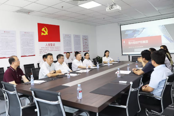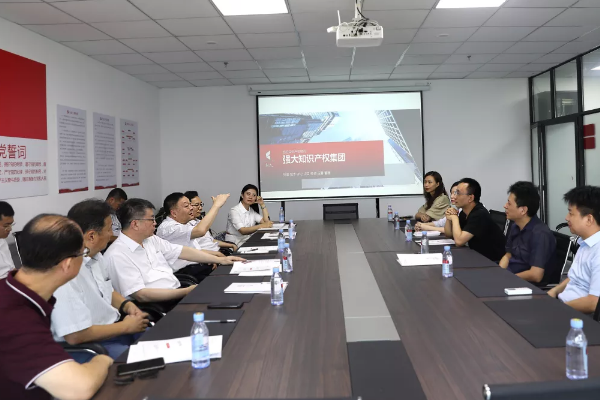 黄书凯先生向领导们汇报了强大知识产权集团的基本情况、业绩成果及管理运营模式,沈嘉女士也对强大集团的服务理念及产品进行了汇报。