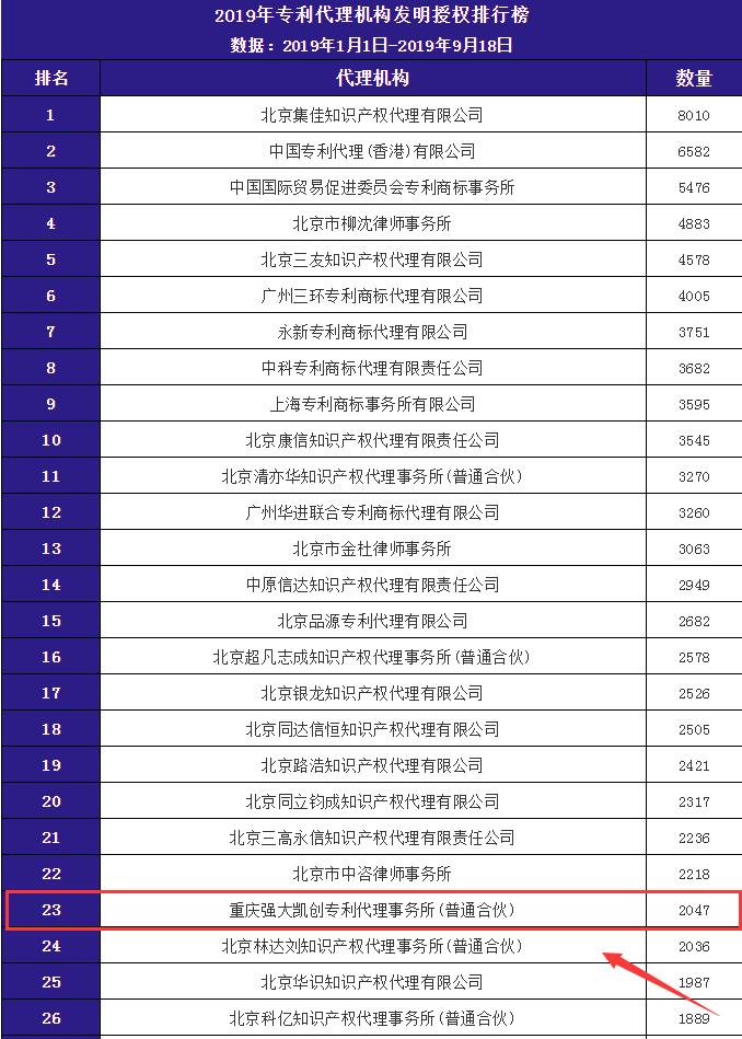 9月19日,微信公众号“IPRlearn”发布了2019年1月1日-2019年9月18日发明专利授权机构前100排行榜,重庆强大凯创专利代理事务所(普通合伙)以2047件强势入榜位列第23名,是西南地区唯一进入榜单前25的专利代理机构!