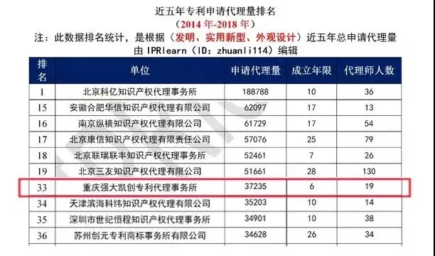 4月份IPRlearn微信公众号发布的近5年全国专利申请代理量前100机构榜单中,重庆强大凯创专利代理事务所位列第33名。