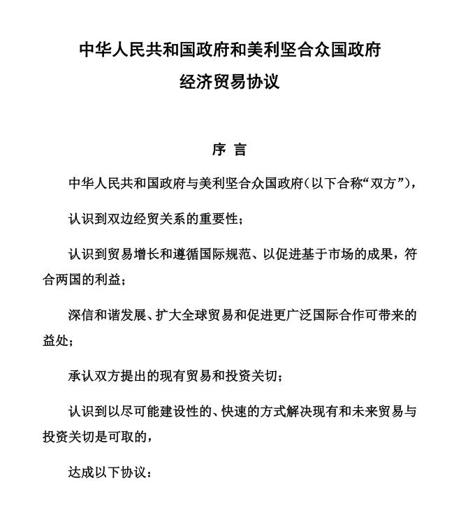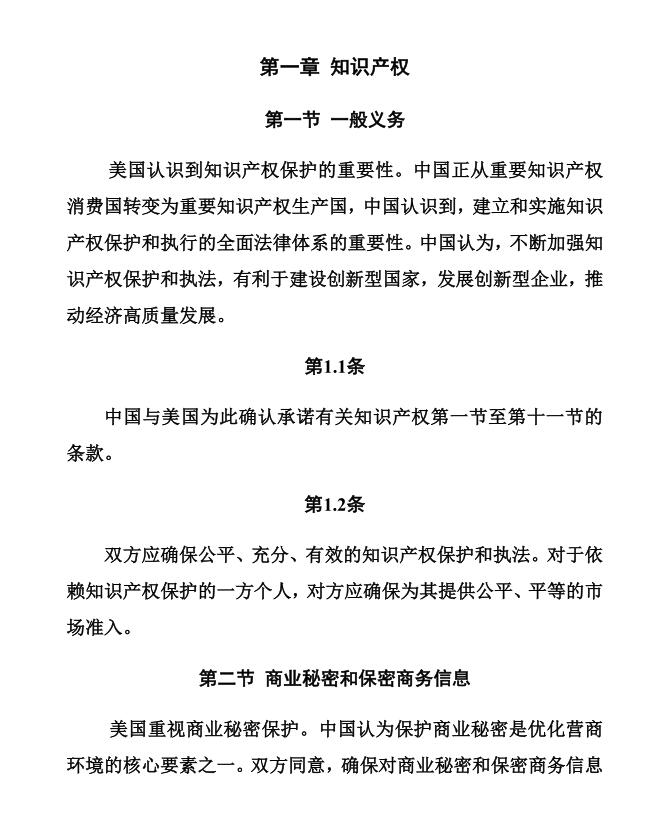 美东时间2020年1月15日,经过中美两国经贸团队的共同努力,在平等和相互尊重的基础上,中美双方在美国首都华盛顿正式签署第一阶段经贸协议《中华人民共和国政府和美利坚合众国政府经济贸易协议》(以下简称《协议》)。协议文本包括序言、知识产权、技术转让、食品和农产品、金融服务、汇率和透明度、扩大贸易、双边评估和争端解决、最终条款九个章节。
