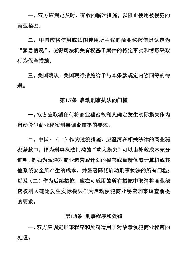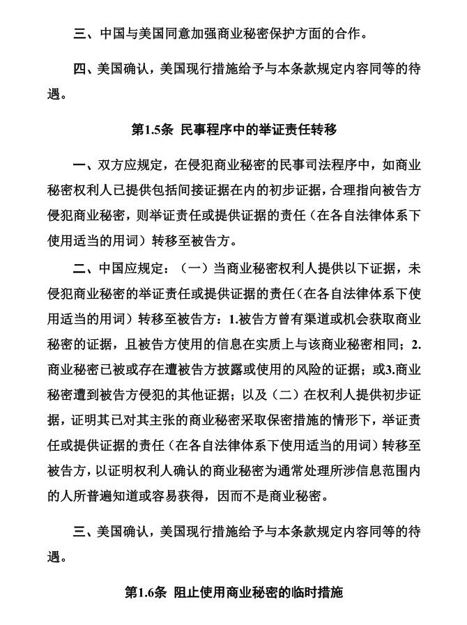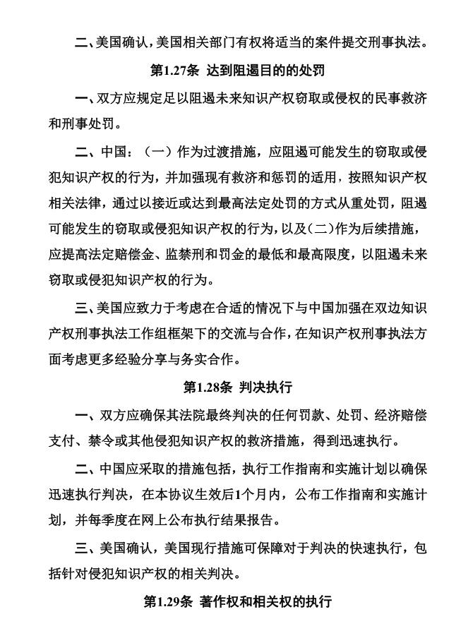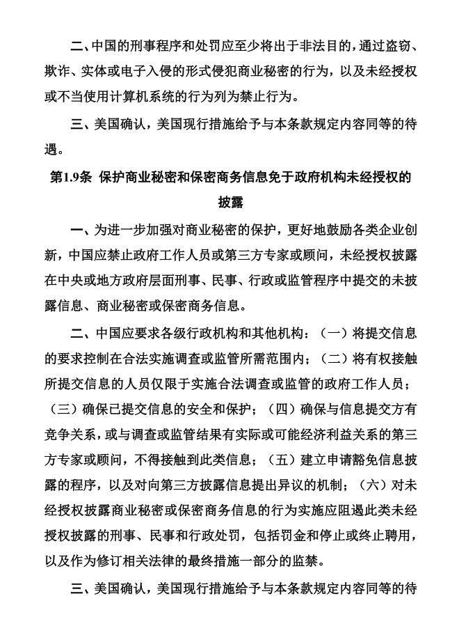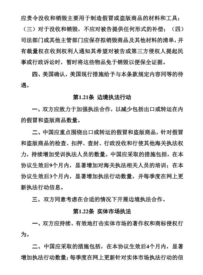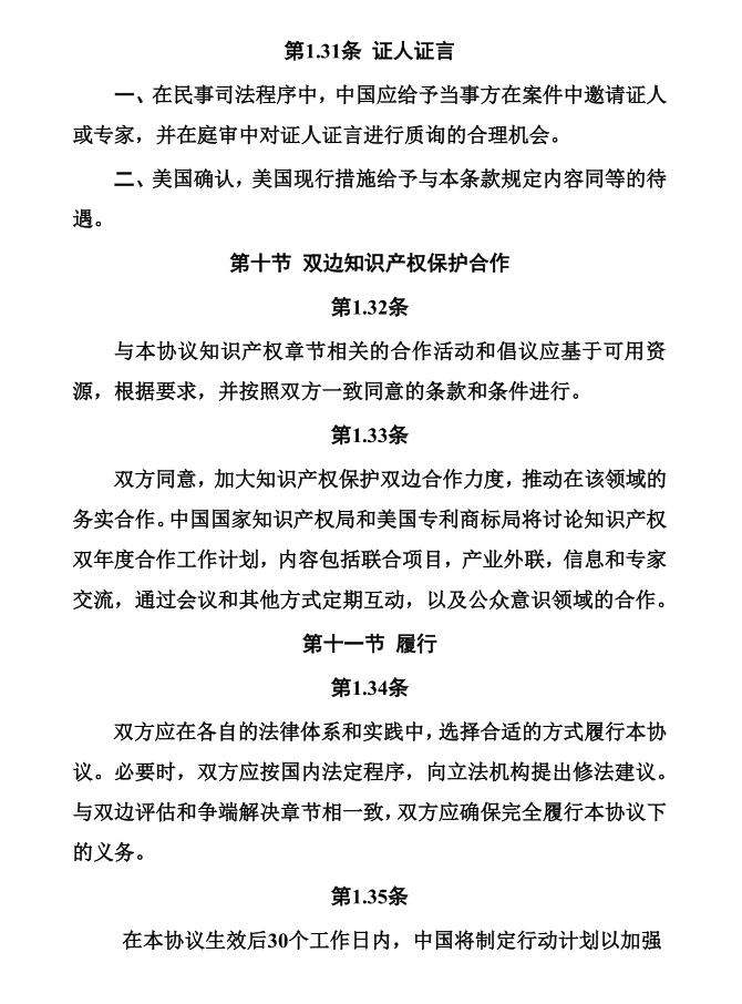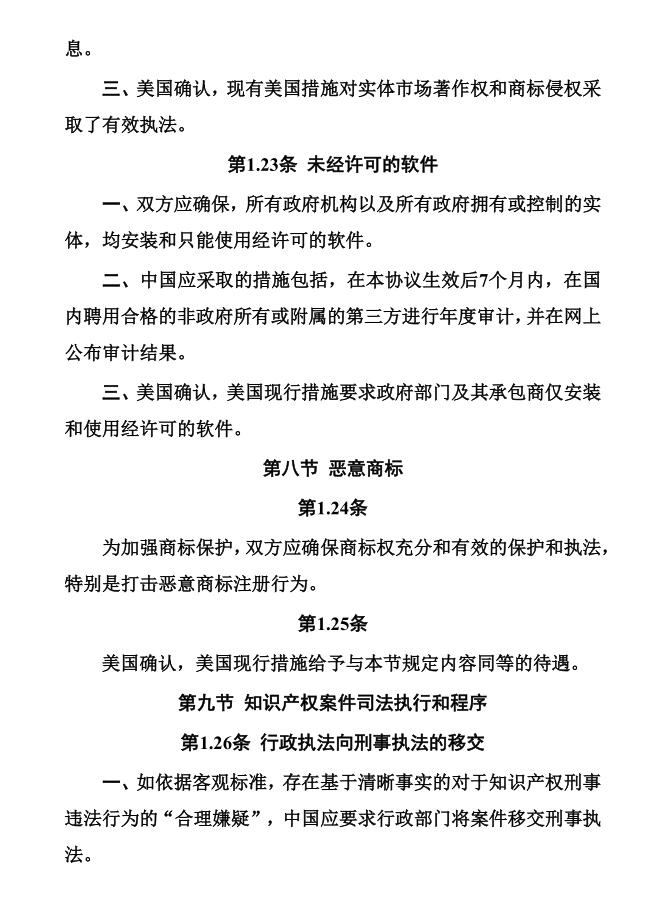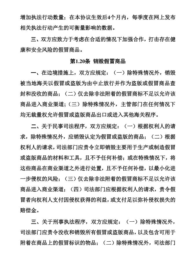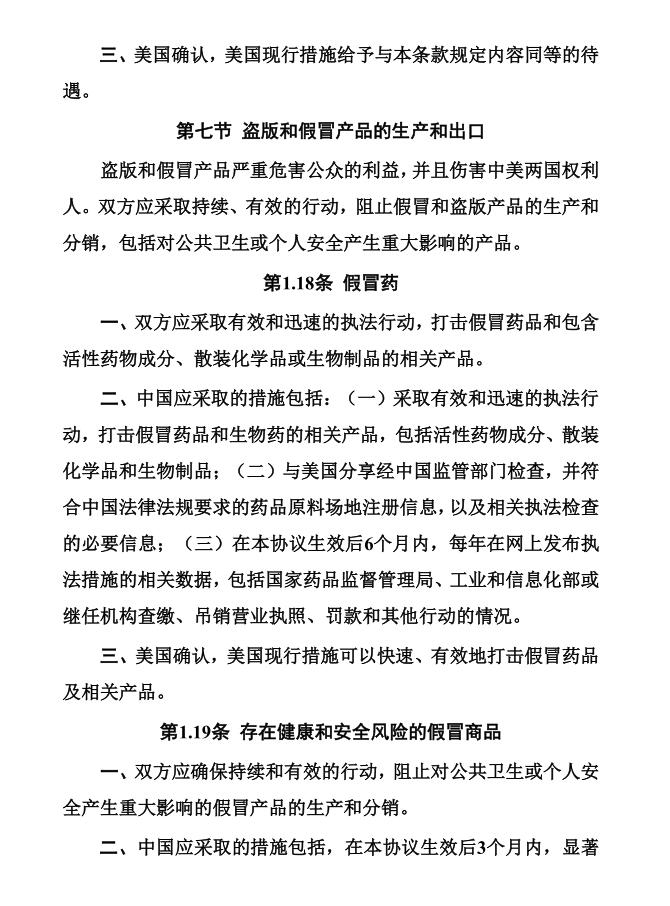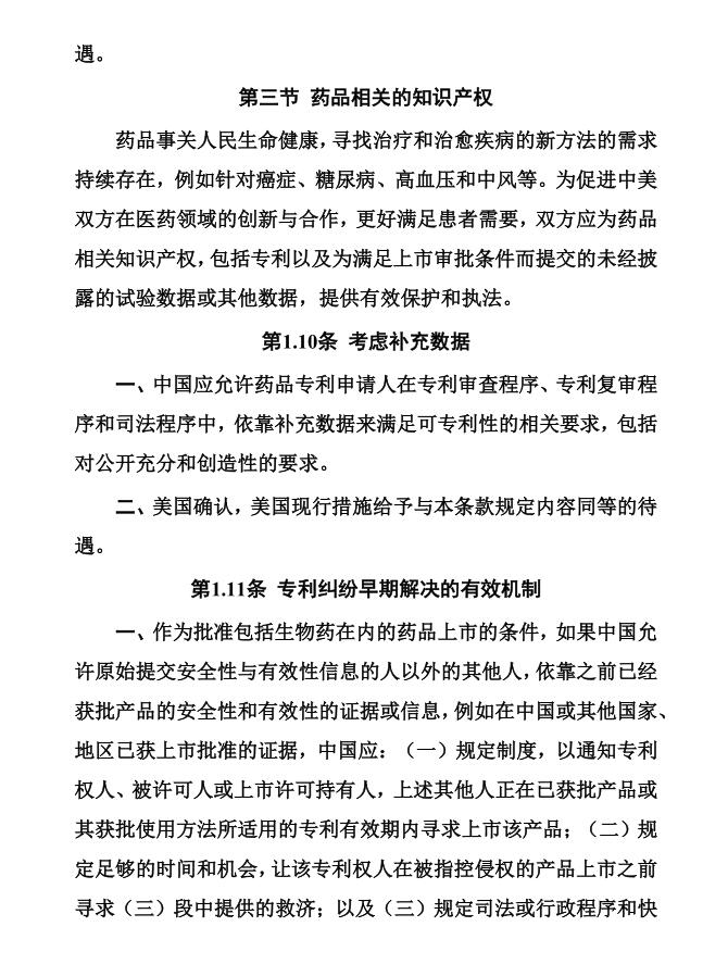 中美双方就加强知识产权保护进行了深入讨论,双方同意,加大知识产权保护双边合作力度。在商业秘密、机密商业信息、与药品相关的知识产权问题、专利有效期延长、电子商务平台上存在的盗版和假冒、地理标志的保护、防止商标恶意注册等方面,中美双方达成共识。