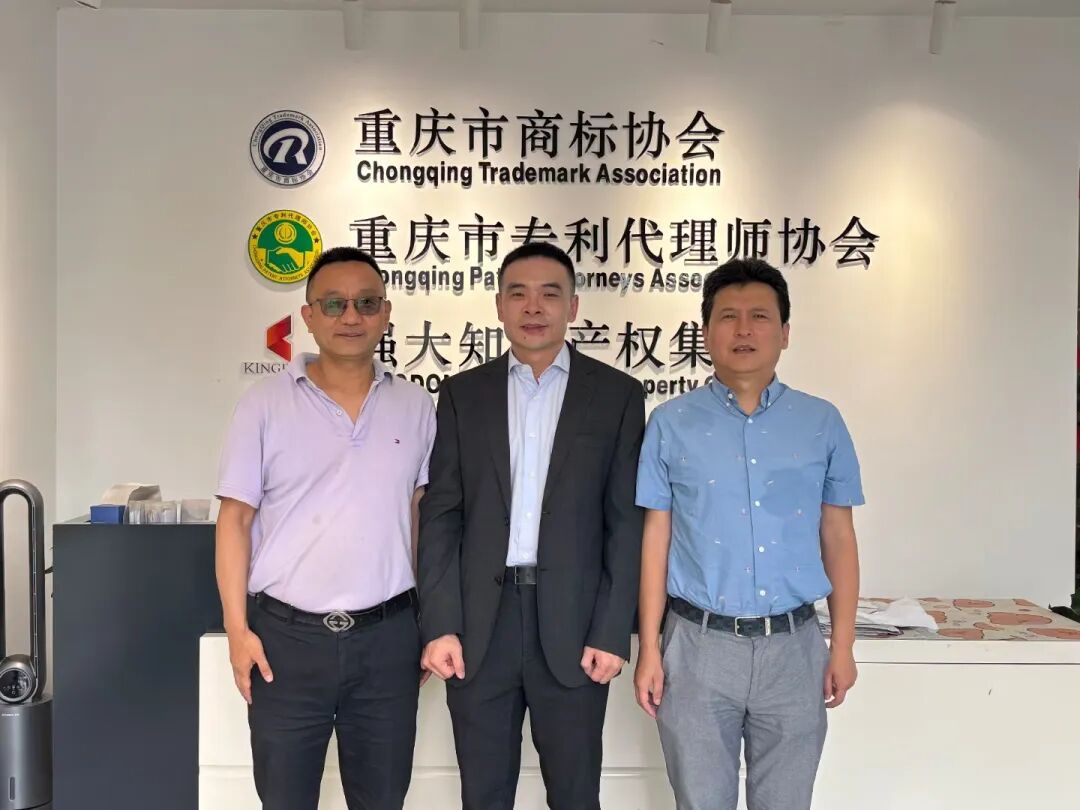 强大知识产权集团董事长黄书凯、总裁王强与新加坡知识产权局高级处长曹兴海合影留念